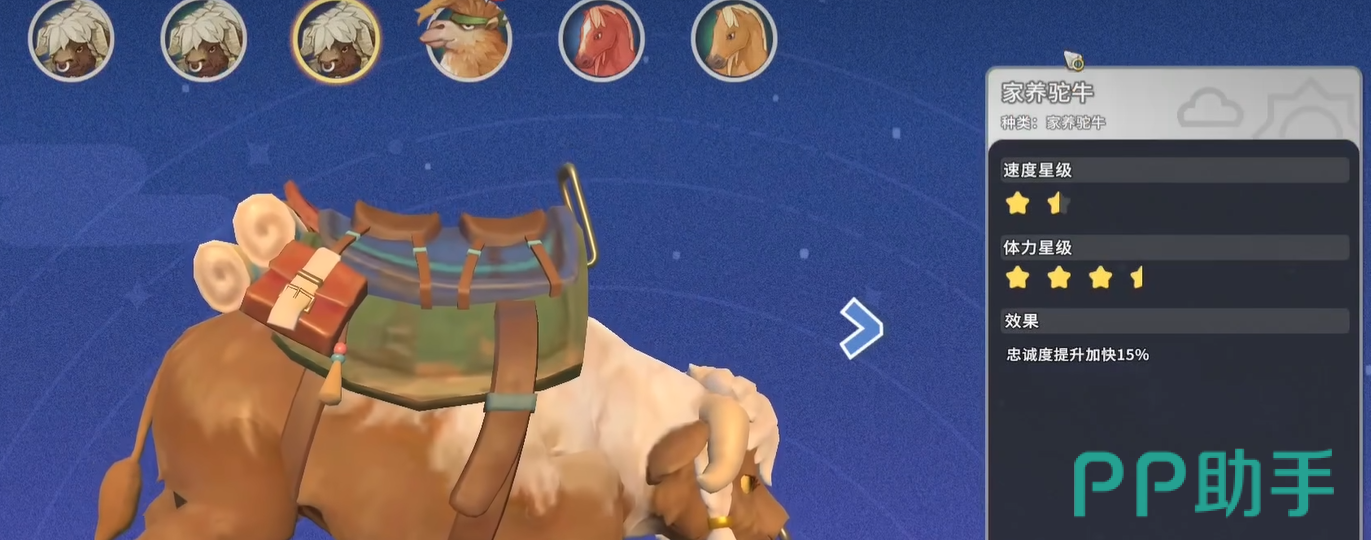 驮牛则代表另一种实用主义路径。其移动速度低于马匹,但具备不可替代的载具特性:骑乘状态下自动扩容背包容量。该机制大幅优化资源运输动线——单次远行即可满负矿石、木材、草药等采集物,避免高频往返造成的重复时间损耗。同时,驮牛普遍拥有更高体力上限,支撑长时间野外作业,契合深度采集型玩法。