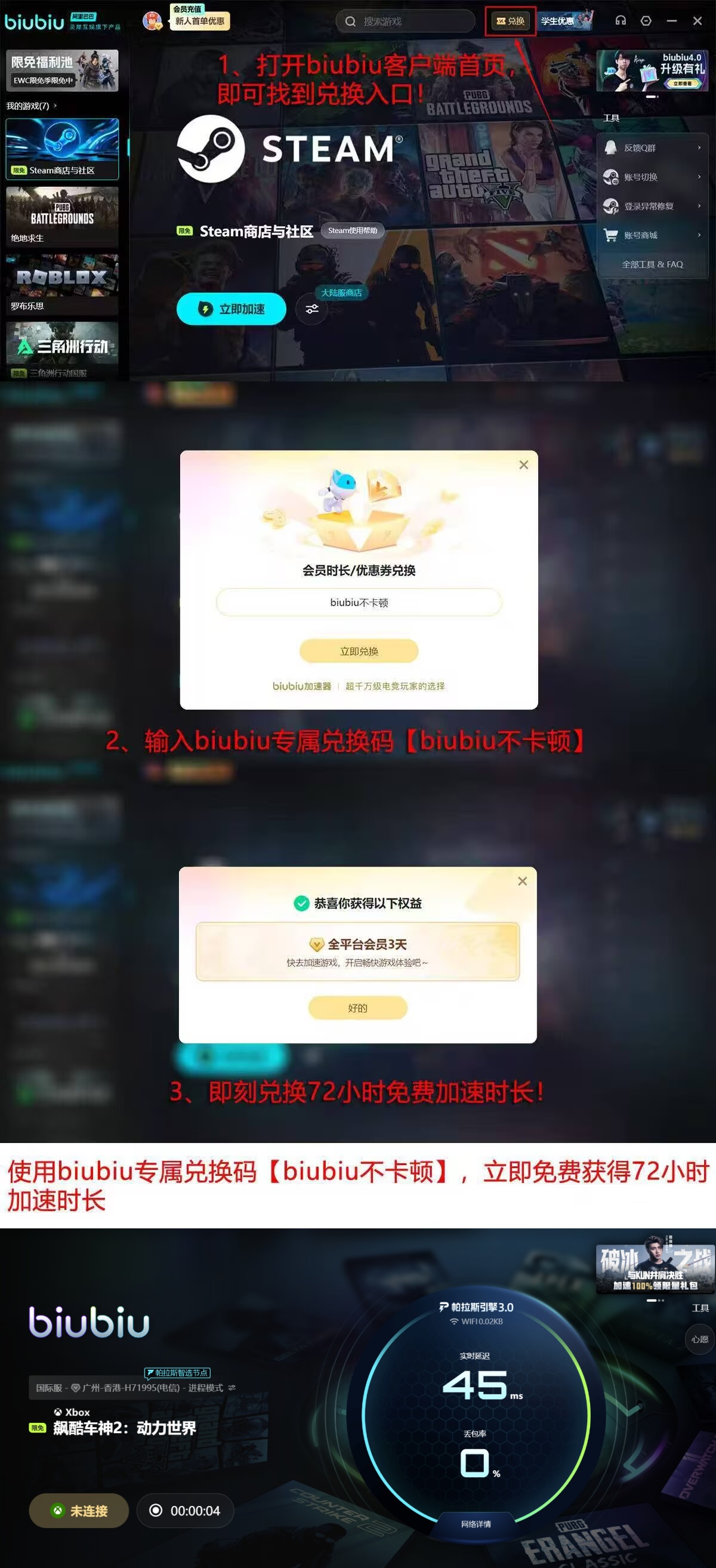 依托阿里巴巴灵犀互娱底层技术架构,该加速平台在协议识别精度与节点调度响应速度方面具备显著优势。新注册用户完成首次登录后,系统自动发放24小时全游戏通用加速时长;所有用户输入口令【biubiu不卡顿】,即可即时领取3天高级会员权限,涵盖低延迟专属通道、多开隔离保护及限免游戏专区优先访问权。限免专区每日更新适配游戏列表,确保热门作品零门槛接入。