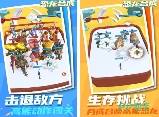 一款以“合成进化”为核心机制的益智类手游。规则清晰:将两只同等级恐龙拖拽至同一格,即可融合升阶,解锁更强大形态;勇士角色亦遵循相同逻辑。关卡设计注重布阵策略,需根据敌人属性合理部署单位位置,发挥群体协同优势。全游戏包含数十个难度递进的挑战关卡,节奏明快,反馈及时,兼具解压性与成长感。