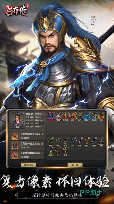 以经典三国题材为基础,高度还原原著人物关系与势力格局。战棋系统支持兵种克制、技能连携与站位联动,例如弓兵远程压制、骑兵侧翼突击、步兵正面牵制等组合策略。关卡目标清晰明确,通关条件以歼灭敌方主将或占领指定区域为主。美术风格采用极简黑底配高对比度UI,突出角色立绘与战斗反馈,界面信息传达高效直观。武将可通过培养提升基础属性与专属技等级,强化战场适应性。