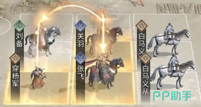 另一套高适配性阵容为经典“桃园三结义”体系——张飞、关羽、刘备。在此组合中,张飞定位为“副C兼功能型前排”,既可补充关羽的多段输出缺口,又能配合刘备的机制型辅助形成正向循环。刘备作为核心辅助,通过叠加机制在限定时间内提升单体爆发,并间接强化张飞的范围伤害效能;关羽则以高频攻击持续施压。三者协同的关键在于追击格子的精准分配:必须确保张飞与刘备处于同一追击链路,方可触发攻击次数叠加,最大化连携收益。该阵容兼顾坦度、输出与策略纵深,是中期过渡至后期的重要基石。