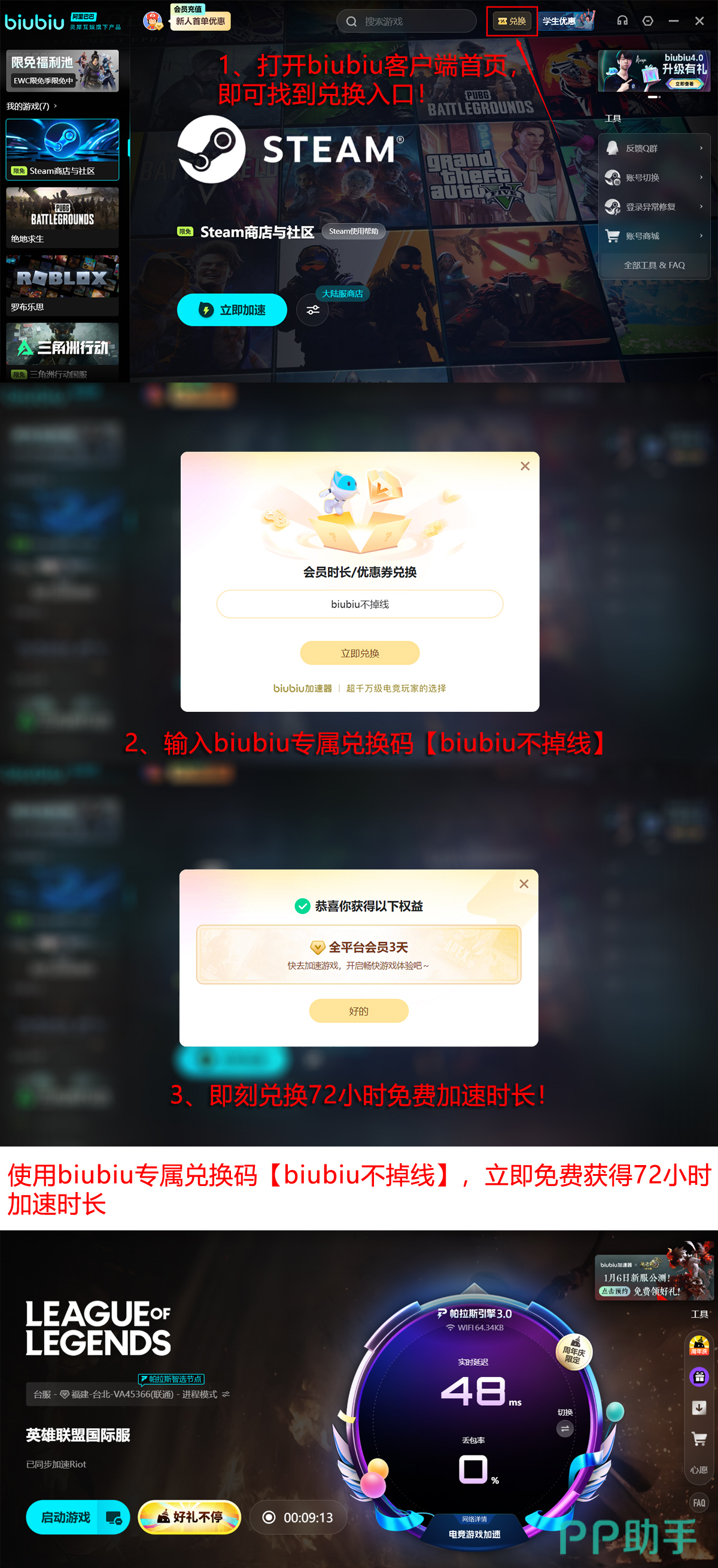 新用户注册即可获得专属提速权益:输入激活码【biubiu不掉线】,立即领取3天高级加速服务;叠加注册即赠的24小时基础时长,总计可享96个小时免费体验。