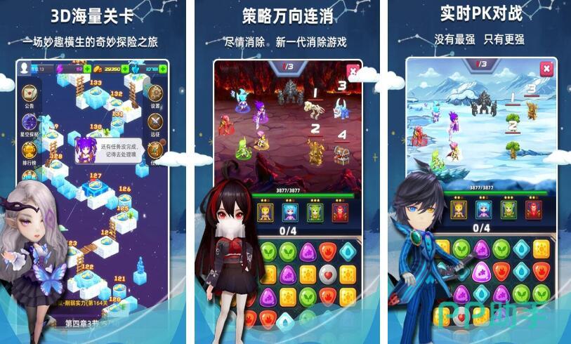 这是一款融合三维场景与星座拟人设定的消除类作品。全游戏共设12位星座向导角色,每位均拥有专属语音、剧情线与技能体系。核心机制为“万向联销”,允许玩家在立体空间中任意旋转、拖拽图块进行多维匹配,突破传统横纵轴限制。此外,实时跨服PK系统支持毫秒级匹配,让策略与手速同步接受考验。