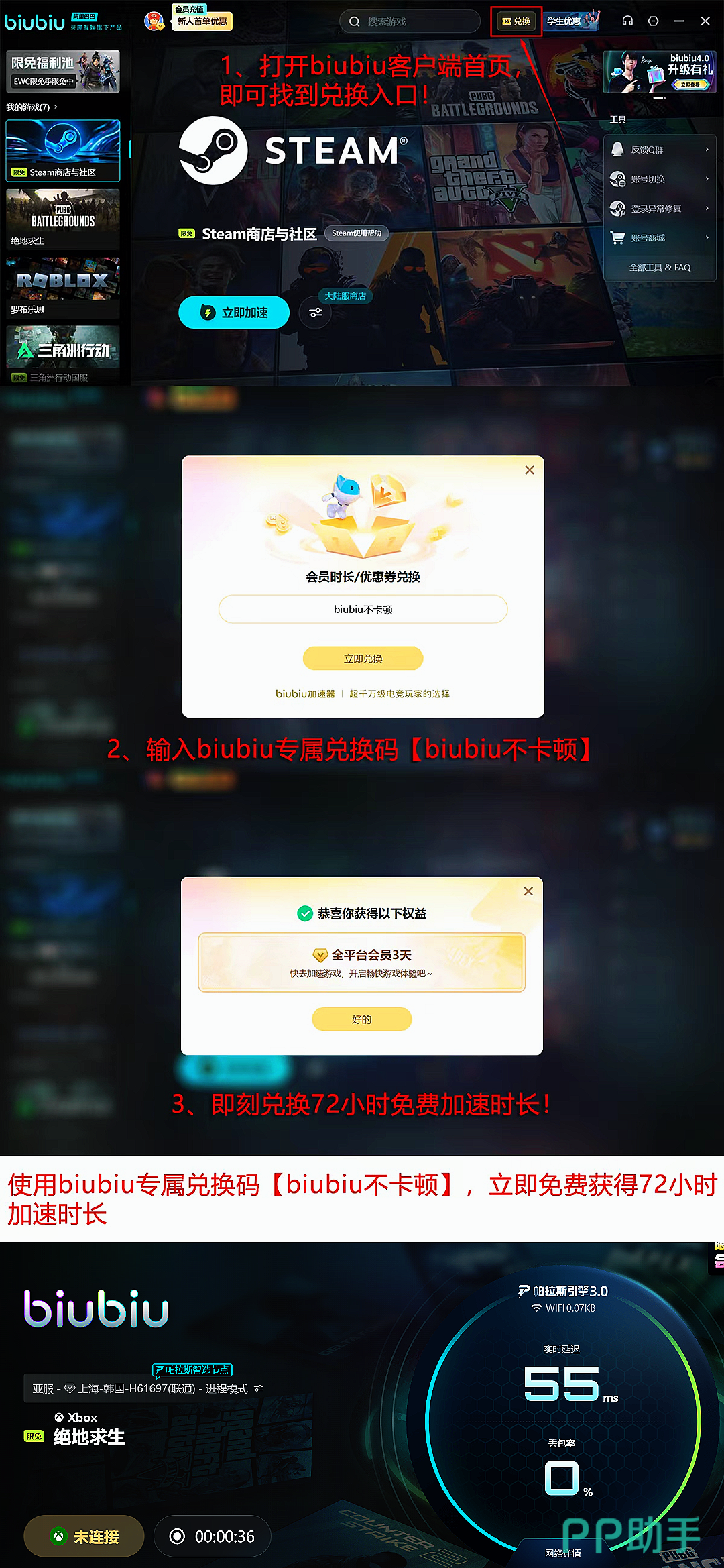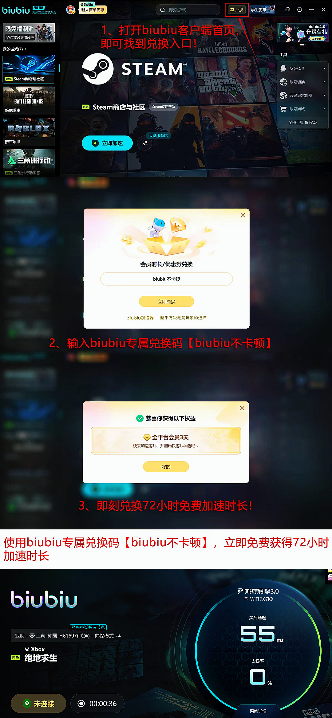 biubiu加速器在用户体验层面亦有突出设计:新用户完成账号注册后,即可立即启用全场游戏通用的24小时免费加速权限;输入专属兑换码【biubiu 不卡顿】,还可额外获赠3天加速时长,总计享96小时无限制加速服务。该福利同步开放予老用户,无需区分账户类型,所有用户均可参与领取。
