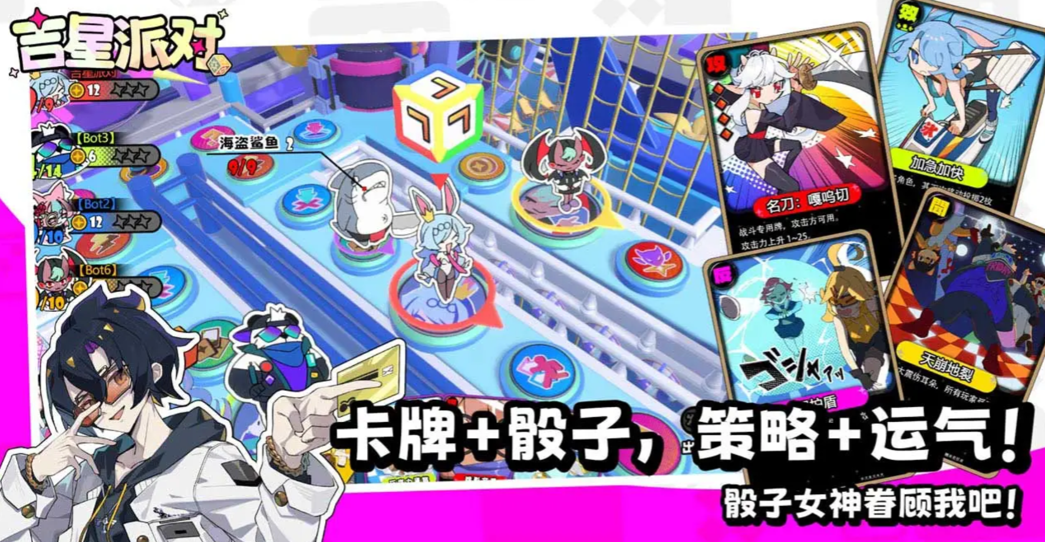 游戏核心玩法融合大富翁式移动机制与卡牌构筑系统。玩家在共享地图中通过掷骰决定行进步数,途中将触发随机事件、购置资产、激活区域效果等多样化交互。同时,卡牌抽取与使用贯穿全程,涵盖资源调度、状态增益、战术干扰及即时战斗等多个维度。战斗环节强调技能释放时机、冷却管理与目标选择,需结合角色特性进行预判与配合。