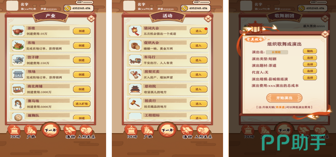 本作以长安城为舞台,打造高度拟真的市井经营模拟系统。玩家从一家小型茶肆起步,在西市与东市之间开展货物流通,逐步拓展商业版图。建筑形制严格参照唐代营造法式,NPC行为逻辑融入节令习俗与坊市制度,增强时空真实感。除经济管理外,游戏内置职官晋升机制,玩家可通过科举考试逐级升迁,完整经历从布衣至朝臣的身份跃迁过程。
