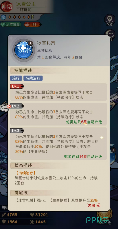 作为神话品质蛇灵,冰雪公主的核心机制围绕“治疗压制”与“持续回复”双线展开。其主动技能【冰雪礼赞】可自动锁定己方生命比例最低的3名队友,为其恢复相当于自身攻击力68%的生命值,并附加【持续治疗】效果——该状态将在每回合结束时,再次恢复冰雪公主攻击力15%的生命。随着星级提升,该技能持续强化:6星时治疗量提升至攻击力83%,14星时进一步增至98%;当受治疗目标生命低于50%时,额外赋予等同于自身攻击力30%的[生命护盾]。在蛇灵觉醒后,该护盾数值还将提升35%。