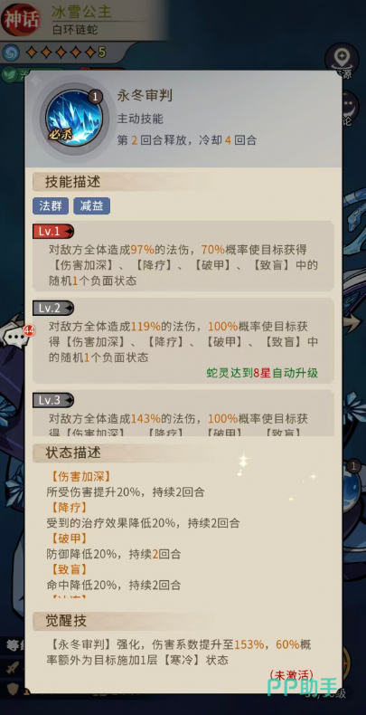 另一核心技能【永冬审判】为全体敌方单位施加高额法术伤害与复合控制。基础形态下,造成97%法伤,并有70%概率附加【伤害加深】(提升所受伤害20%);同时随机触发【降疗】(降低目标所受治疗20%)、【破甲】(降低防御20%)、【致盲】(降低命中20%)三者之一。进入强化阶段后,伤害提升至143%,【伤害加深】触发概率达100%,并新增【冰冻】(无法行动,持续至承受2次攻击后解除,每回合限1次)、【沉默】(禁用主动技能)两种可选负面效果;此外,还有40%概率额外叠加1层【寒冷】(每层降低防御4%、速度5%,最多叠加5层,持续2回合)。觉醒后,伤害进一步提升至153%,【寒冷】的附加概率提高至60%。