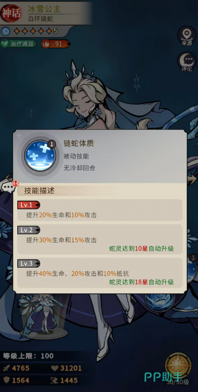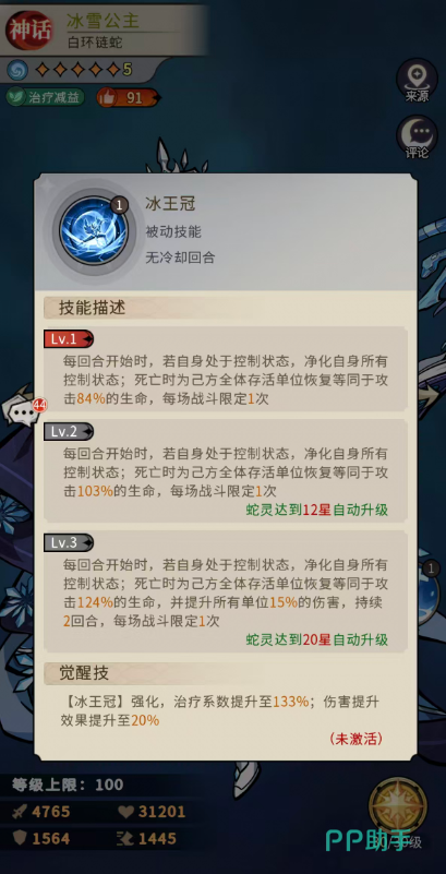 被动技能【链蛇体质】提供基础属性增益:初始提升20%生命与10%攻击;升至二级后增强为30%生命与15%攻击;满级三级时可达40%生命、20%攻击及10%抵抗。而终极被动【冰王冠】则赋予关键生存机制:每回合开始时,若冰雪公主处于控制状态,将立即净化全部控制效果;阵亡瞬间,为所有存活队友恢复等同于自身攻击力84%的生命值。该效果整场战斗仅触发一次,但经强化后,最终治疗量可提升至攻击力133%,显著延长队伍整体作战周期。