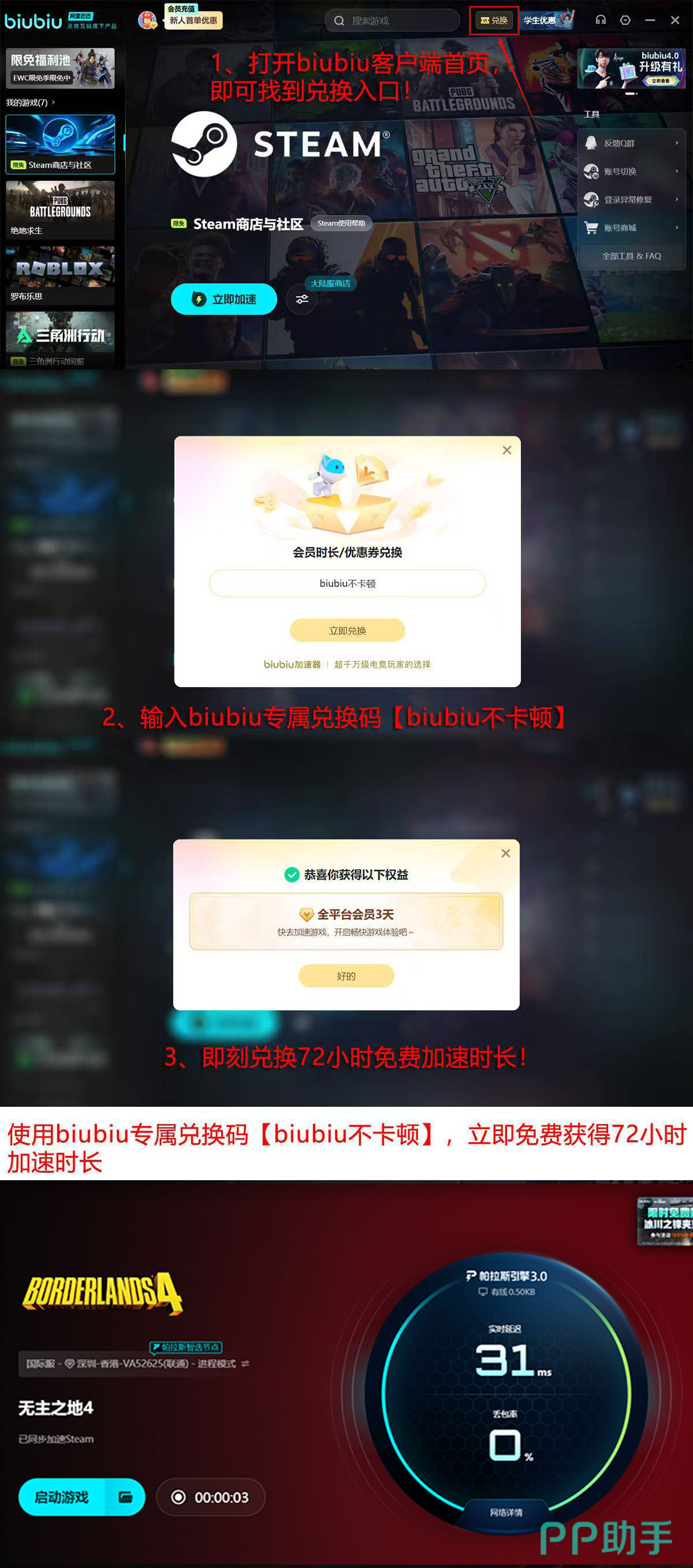 对于《无主之地4》这类依赖稳定低延迟连接的联机向射击游戏,网络质量直接决定运行流畅度。现提供新用户专属体验权益:完成注册后,系统自动发放24小时高级权限;登录客户端,在首页点击“兑换”入口,输入口令【biubiu不卡顿】,即可额外获得72小时使用时长。两项福利可叠加,总计享96小时无限制加速服务。