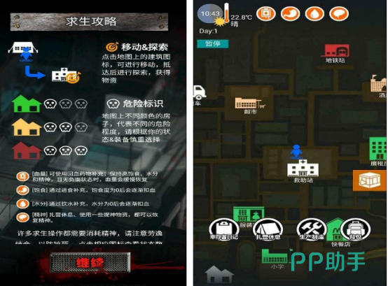 游戏以极简视觉语言呈现后启示录世界,主角仅携一只忠诚犬类伙伴展开求生之旅。所有武器、防具与工具均需从超市、加油站、警察局、避难所等现实感强烈的地点拾取获得,每处场所附带独立危险等级标识(如血迹浓度、门窗破损度、声音活跃值),提示潜在威胁强度。生存逻辑贴近物理常识,例如雨水可净化水源、火把能驱散低阶感染者、犬只可预警伏击等。