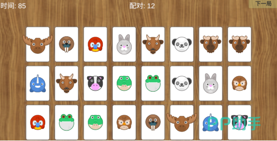 基于记忆广度与瞬时回忆能力训练的配对游戏,构建童话风动物王国场景。初始阶段展示全部动物卡片布局,倒计时结束后进入翻牌匹配环节,玩家需凭借空间记忆定位相同动物位置,关卡节奏由缓至急,逐步提升记忆负荷阈值。