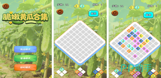 基于三消核心机制延伸开发的休闲益智作品,采用清新明快的视觉风格。主界面集成挑战模式、普通模式双路径,玩法围绕“拍黄瓜”“拌黄瓜”等生活化主题展开,底部随机生成皇冠图标,玩家通过滑动操作完成三连消除,触发连锁反应与特效反馈。