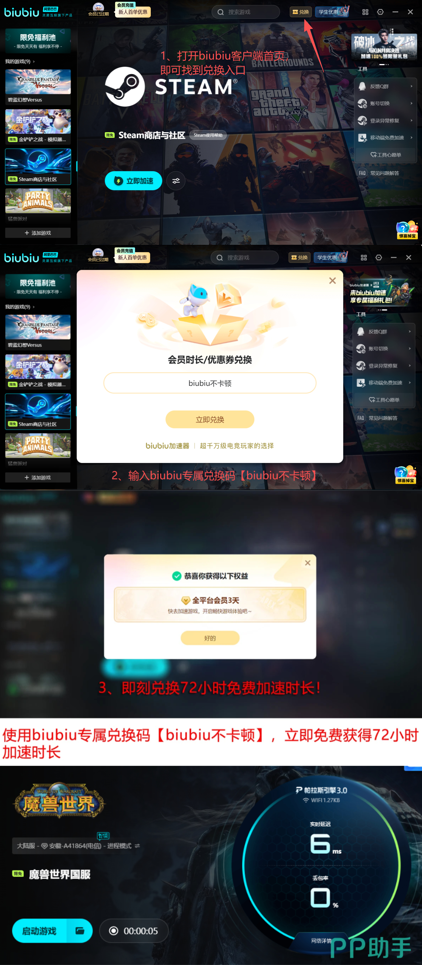 新用户注册即可获赠24小时全平台通用加速时长,输入专属激活码【biubiu不卡顿】,还可额外领取72小时加速权益,总计96小时免费使用额度——足以覆盖多个团队副本周期的完整开荒流程,或支撑多场高强度评级战场对抗,从根本上规避由网络波动导致的操作失准与节奏断裂。现在就开启加速服务,为你的艾泽拉斯征程筑牢网络基石。