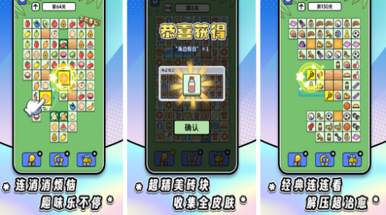 打破传统休闲益智消除所带来的欢乐,竖屏布局层层递进,延续相同图案,连接消除让特色核心,后期关卡融入丰富的策略元素,进入游戏之后,点击两个相同图案,即可轻松消除,也有完整的动态翻牌机制,每次点击都会直接显露图案的每个角,这样的特色玩法,增强策略。