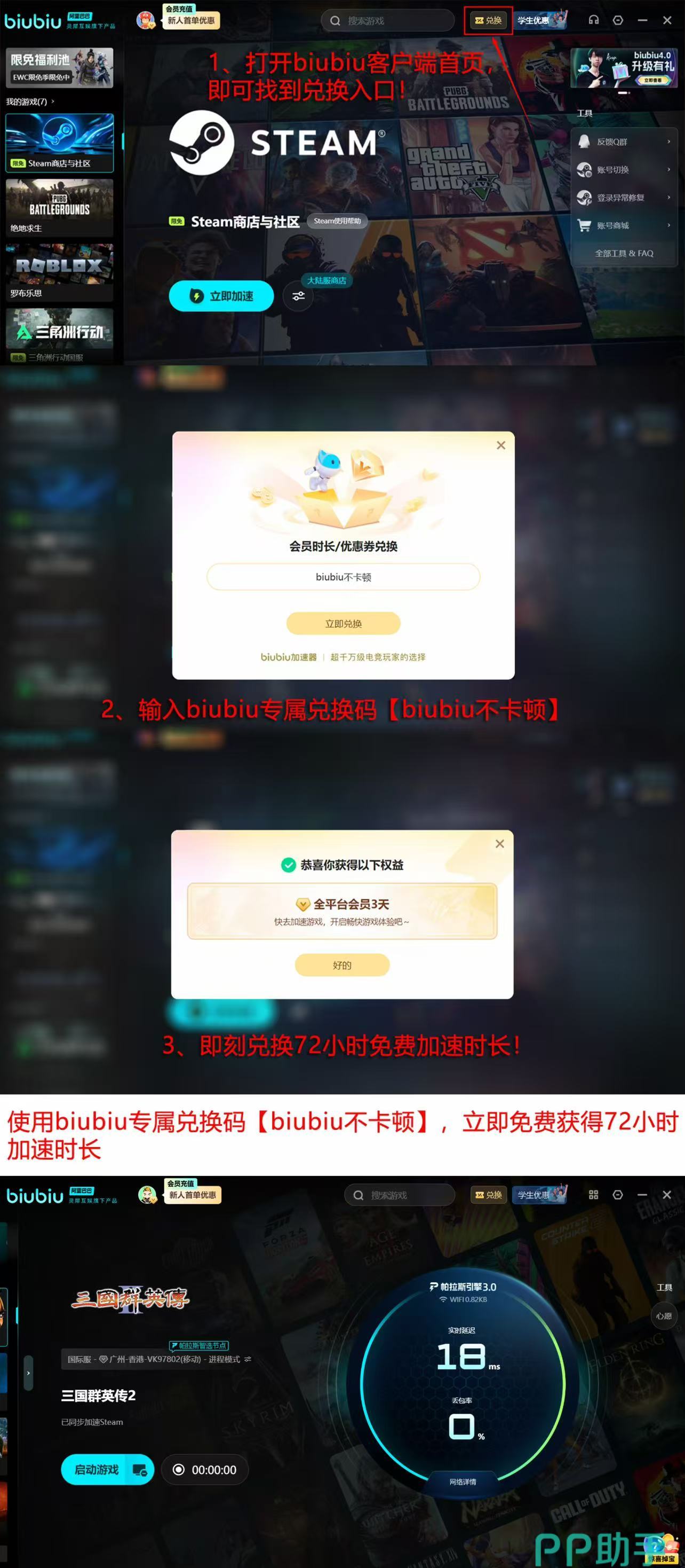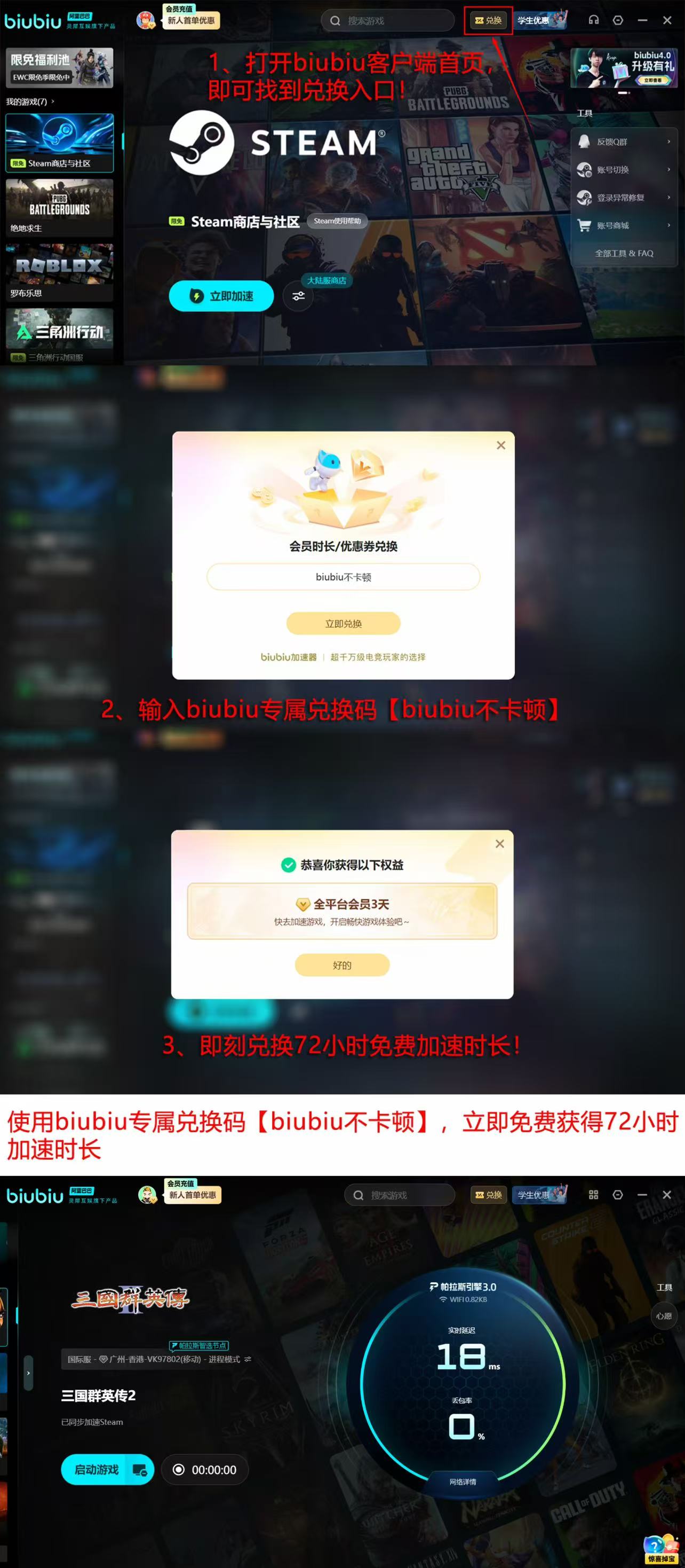 现在正值biubiu的活动期间,只要是新用户就可以通过注册来立刻获得24小时免费加速时间,然后还能参与【biubiu不卡顿】兑换码活动,领取额外的3天加速时间,这个兑换码福利新老用户都可以使用哦。等于说新人一共能获得96小时的免费加速时间,是不是特别贴心呢。如果过了试用期还想要继续感受biubiu的强大功能,也可以享受大学生认证优惠政策和首次充值优惠,建议喜欢玩游戏的朋友们都入手一款,特别是喜欢联机的小伙伴。