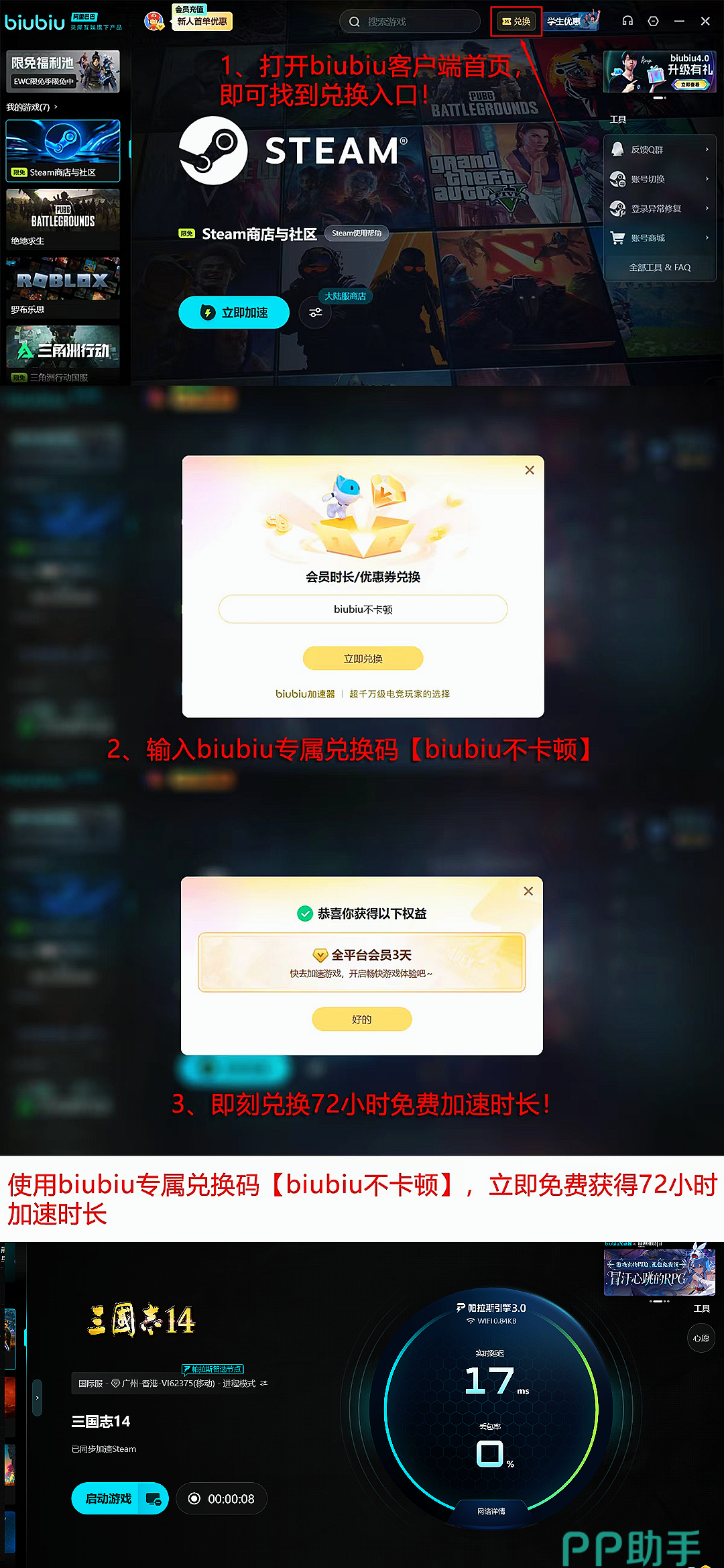 很多玩家使用biubiu以后基本上都给了好评,而且新用户注册biubiu就可以获得24小时全场游戏免费加速时间,加速期间所有路线都能选择,并且使用兑换码【biubiu不卡顿】就能额外再领3天免费加速时长,一共能获得96的长效加速,而这项优惠老用户也是能享受的,没有任何的限制,福利这块是到位的哦。