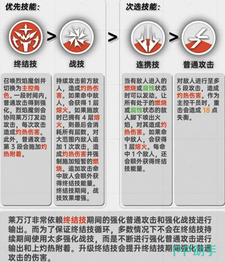 玩家想要培养莱万汀的时候,先要了解他的机制,比如他凭借灼热的伤害作为基础条件。在战斗的过程当中,围绕熔火层数来进行展开,一旦在战斗的过程当中,借助重击能够有效地吸收敌人身上的灼热附着叠加的层数,一旦消耗层数释放的战斗技能,能够有效的解锁额外的伤害。其实他在施展战斗技能跟连携技能的时候,能够有效地加速终结技能的快速回能。而他的终结技能作为爆发的核心所在,一旦开启之后将会有效地强化普通攻击,并且还能够形成大范围内的斩杀。