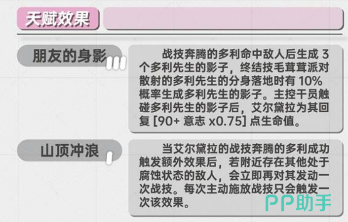 核心天赋这里要重点关注一下。朋友的身影这个天赋挺重要的,主控干员吃到多利先生的影子之后,艾尔黛拉会额外治疗另一个血量最低的队友,虽然只有一半效果,但多一层保障总是好的。还有个天赋是,战技消耗腐蚀后,能施加脆弱效果,提升10%,配合队伍输出很有用。终结技相关的天赋也不错,持续时间加1秒,生成影子概率提升,能量消耗减少15%,这些都能让她的循环更顺畅。