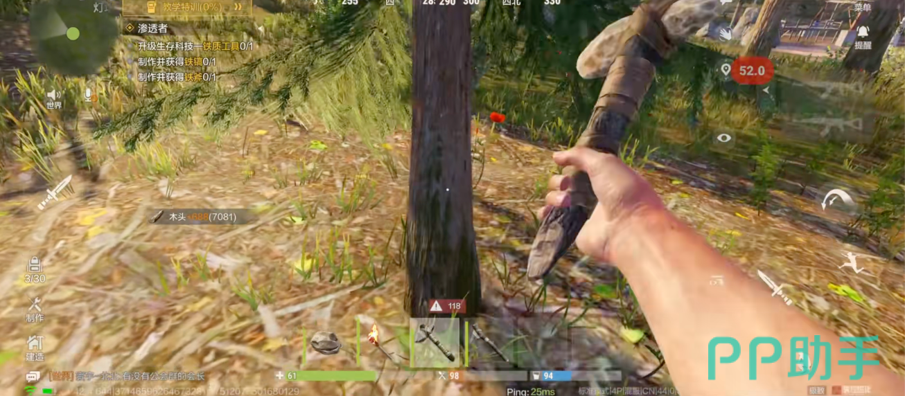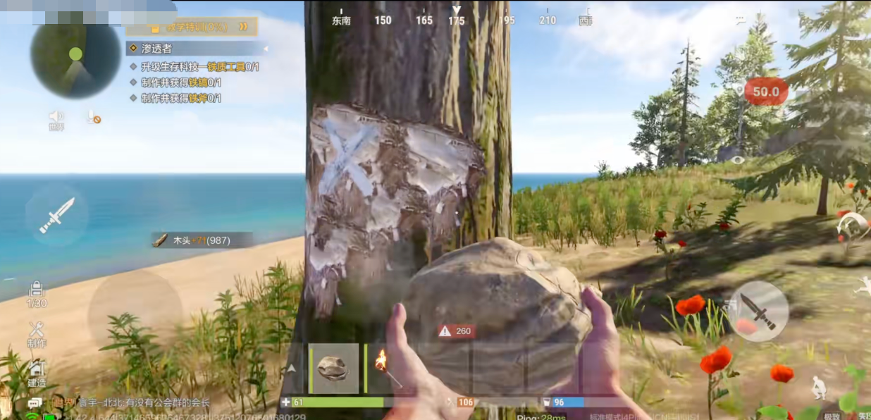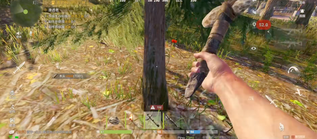 随着玩家游戏的熟练度不断提高,就能够解锁更多的科技内容。一开始只能用石头砸树,慢慢的收集到木料就能够制造高级工具,从而发展到拥有现代武器,以及基地防御城堡。高阶玩家还能使用载具系统,这种从原始到现代的科技跨越让玩家的自信心大大增强,游戏的可玩性也进一步提升。