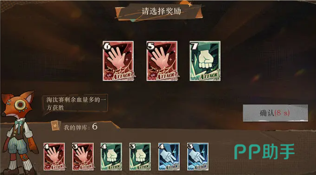选择完卡片,就会正式进入到淘汰赛。通过牌上的克制关系与砰啪点数,决定出售成功情况和造成的伤害,双方开战前可预判对手出牌顺序,安排自己的五张牌,五张牌比拼结束后,血量多的获胜,血量相同,通过投掷硬币决定胜负。