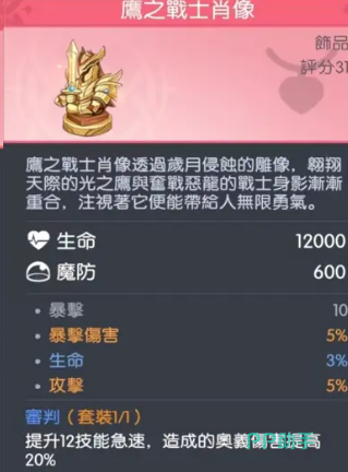 鹰之战士金像:该饰品侧重于战斗容错与输出维度拓展。12000点生命值与600点魔法防御构成中期团战站桩输出的硬性保障;10点暴击、5%法术攻击、5%暴击伤害三重增益覆盖输出核心指标;3%生命值加成进一步拉高残血反打阈值,使洛基在低血量状态下仍保有通过技能组合完成逆转的能力。在高强度对抗场景中,此类功能性装备对整体战力的正向影响不可低估。