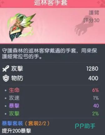 巡林客手套:表面属性倾向物理职业,但与洛基技能机制存在高度协同性。1280点法术攻击进一步夯实输出下限;400点物理防御针对性缓解法师被近战突袭时的生存压力;6%生命值加成提升容错阈值,避免被刺客类角色一套技能直接清空血线;1%攻击速度虽数值微小,却能优化普攻与技能间的衔接节奏,使连招更为流畅自然;套装效果尤为关键——两件套激活后提供200点暴击属性及额外暴击率加成,大幅强化整体暴击覆盖率,支撑高频灼烧与诅咒的稳定生效。