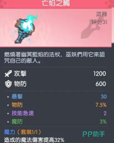 亡焰之触:该装备定位为法师终极输出向核心装,提供1200点固定法术攻击加成,并附带3%魔法防御与7.5%物理防御属性,显著改善法师面对混合伤害时的基础承伤能力。其内置30点暴击属性可有效强化灼烧、诅咒类持续伤害技能的触发频率与稳定性;更关键的是,整套装备激活后可提升32%魔法伤害,实现全技能倍率统一增益,是构建高爆发循环不可或缺的基石。