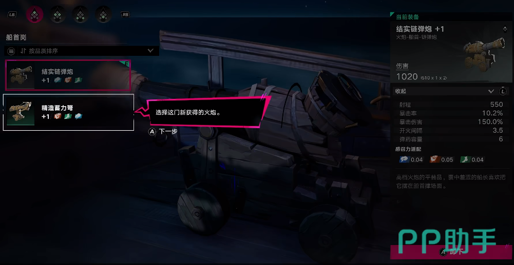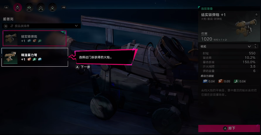 想更换武器也非常简单,只需要选择岗位装配,在装配页面可以分别选择不同的位置,结实链弹炮在船首,打开之后就可以直接点击替换或者卸下,再次点击之后就能进入到具体的装配页面,所有玩家获取的武器都会直接显示出来,可以自行选择更换,精造蓄力弩是在对战过程中获得的全新武器,射程会更远,有需要的玩家可以直接更换,保证自己后续的战斗能力。