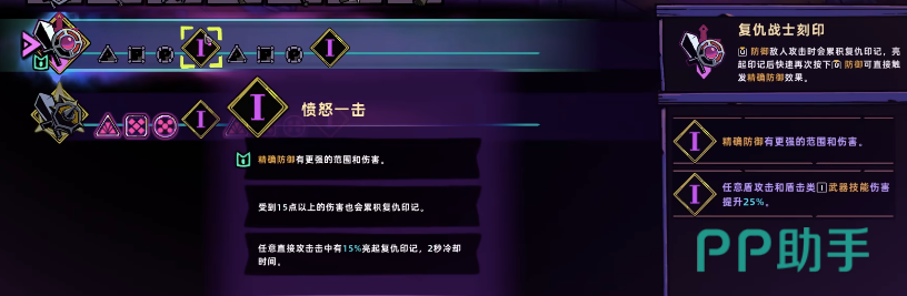 复仇战士刻印对于防御型玩家而言是一个主要的选择,在开启防御姿态之后在抵御敌人攻击时,就会逐渐的累积复仇印记,印记在亮起来时按一下防御,还可以触发精准的防御效果。一级时就能解锁愤怒一击,让精准防御不仅会拥有更广泛的防护效果,还会拥有更高的伤害。即便是受到15点以上的重击,也能累积印记,日常攻击还会有15%的概率去点亮印记,大概只需要两秒的冷却。升级到二级之后,盾击强化效果会拥有着明显的变化。