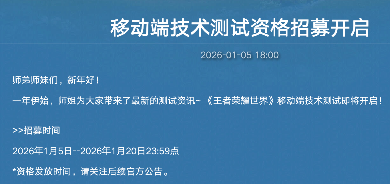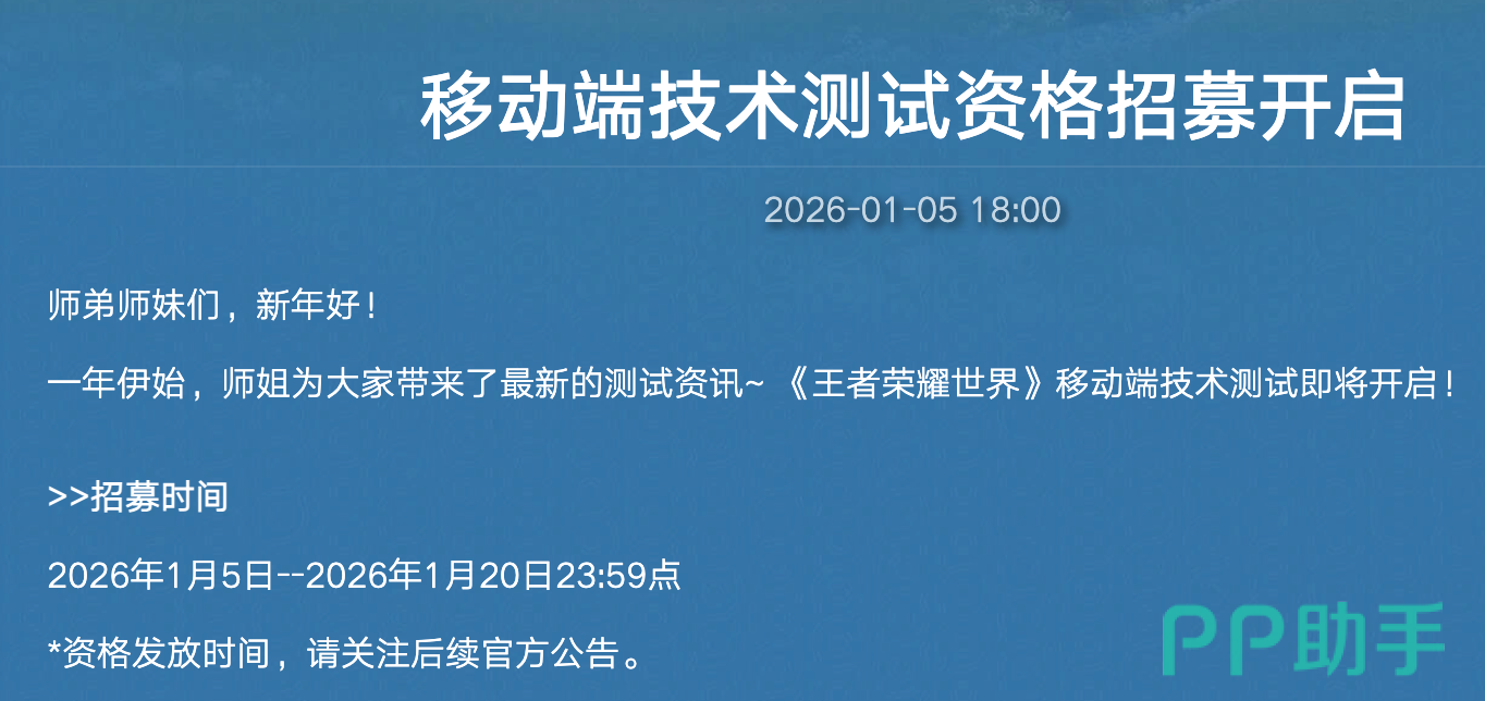 这次王者荣耀世界技术测试的招募时间是从2026年1月5日开始,持续到2026年1月20日23:59结束,在这个时间内,玩家都可以预约申请的,至于具体的发放时间,官方还没有明确公布,大家可以持续关注后续公告,要是想更快速的获取游戏第一手资料,可以点击上方的链接进入豌豆荚专区,那里有很多信息将定期更新。