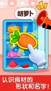 面向2–5岁儿童开发,采用极简交互模型:所有功能仅通过单点触控或短距离拖拽触发,无文字指令依赖。画面以马卡龙色系为主,元素边缘柔化处理,避免视觉刺激过载。内容聚焦基础概念识别——如区分胡萝卜与土豆、辨认锅碗瓢盆用途,并设置渐进式任务链,从“点击清洗蔬菜”到“组合三步制作沙拉”,强化动作记忆与因果理解。