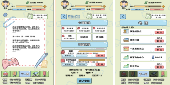 融合模拟经营、恋爱养成与角色扮演要素,玩家以大一新生身份开启大学生涯。游戏开放校内校外共30个可交互场景,涵盖食堂、图书馆等日常空间;支持学院、专业及初始天赋自定义;考试成绩直接影响奖学金评定,增强目标感与代入感。