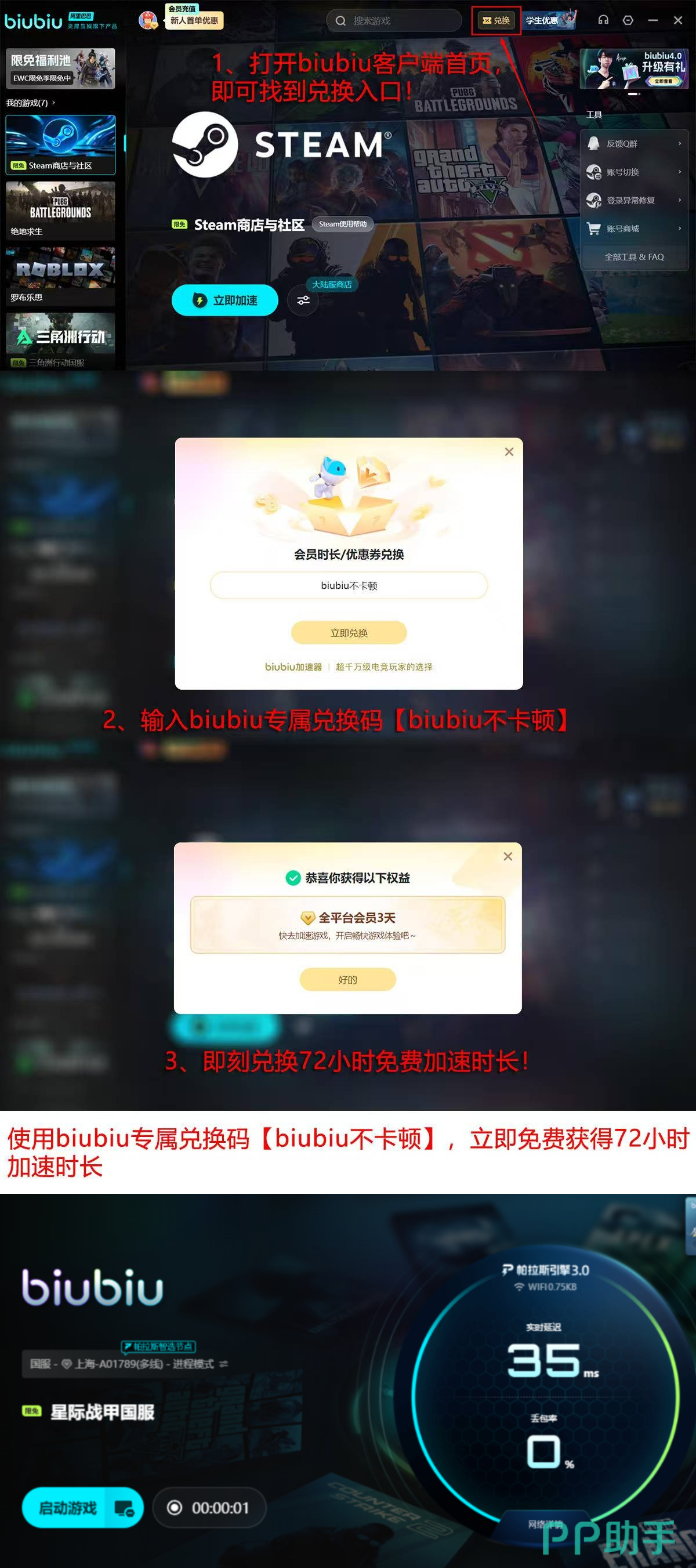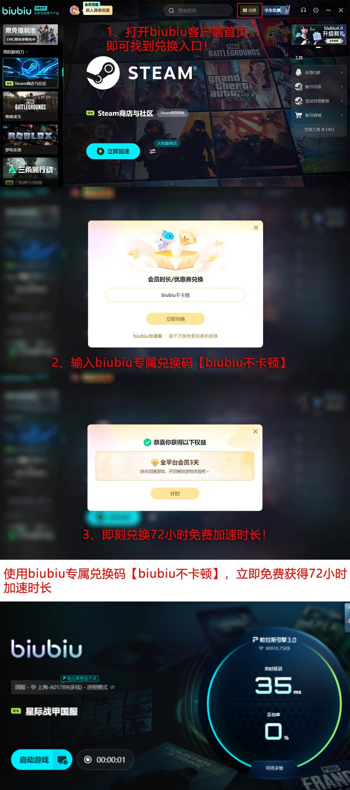 新用户注册并完成登录后,可立即获取24小时全平台免费加速权限;输入激活码【biubiu不卡顿】,还可额外获得72小时深度试用资格,累计96小时覆盖《Warframe》各类高压力场景——包括始源星系大型团战、虚空裂缝限时挑战及钢铁守望突袭任务,全面验证加速效果。