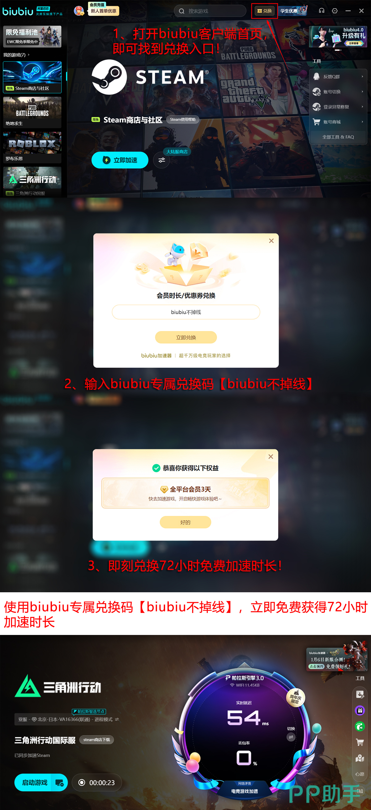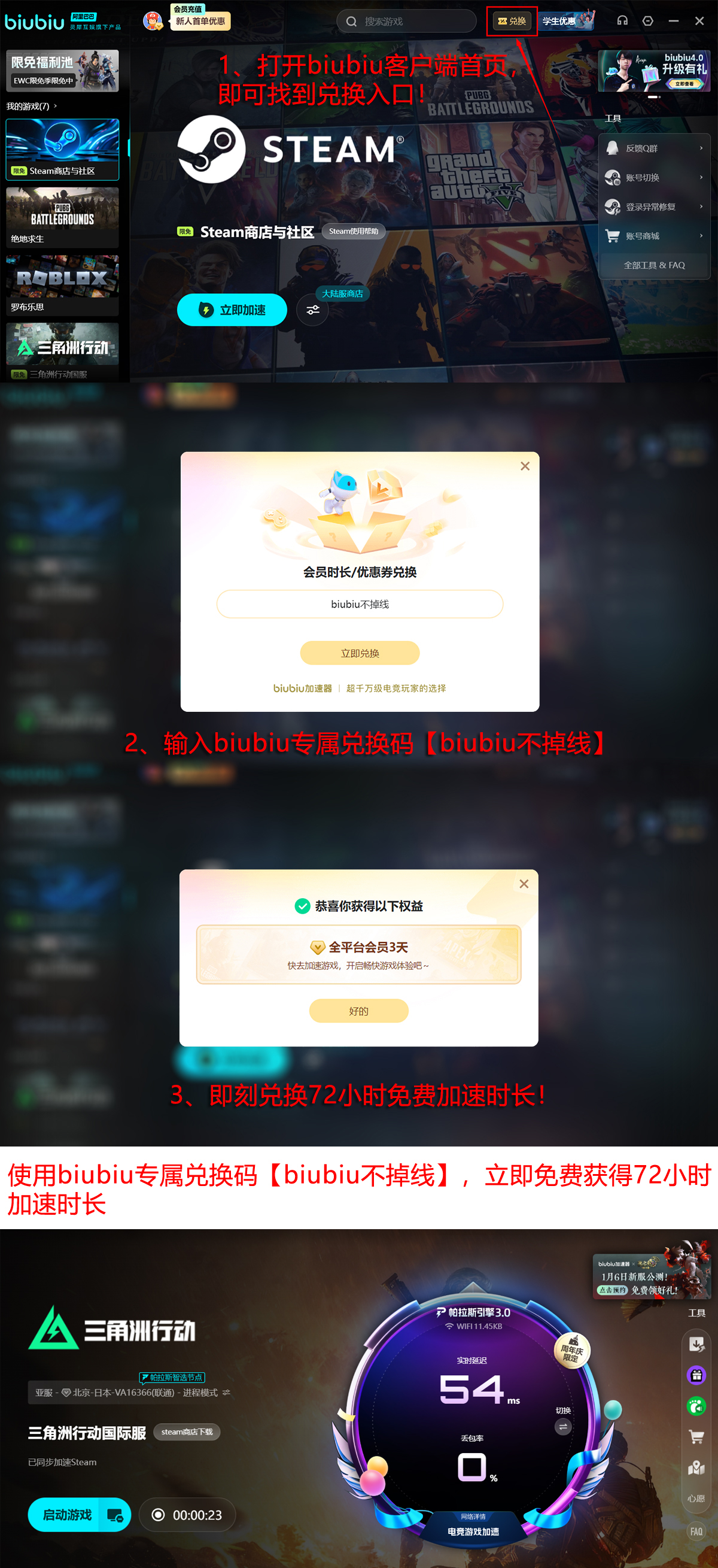 当前通过【biubiu不掉线】活动可即时兑换3天使用权,叠加新用户注册即赠的24小时体验时长,总计可享96个小时免费服务。