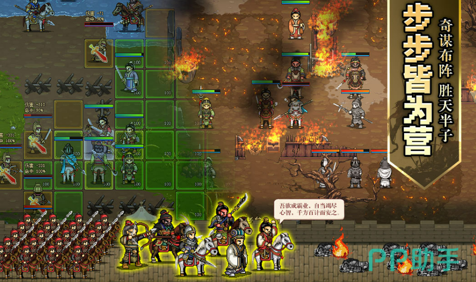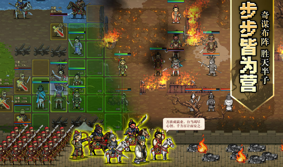 一款以三国历史为蓝本的策略战棋游戏,视角聚焦于刘备视角,时间跨度自黄巾之乱始,至平定蜀中止,严格遵循《三国志》等正史记载,剔除演义式夸张演绎。美术采用复古像素手绘风格,人物立绘与场景建筑均由点阵逐帧绘制,复刻FC红白机时代质感。战场系统强调多维策略要素:地形高低差、兵种克制关系、昼夜时辰变化、天气影响及迷雾遮蔽均需纳入布阵考量。武将具备转职系统,可搭配专属装备与技能链;另含人物图鉴、宝物图鉴与音乐鉴赏模块,满足深度收集需求。