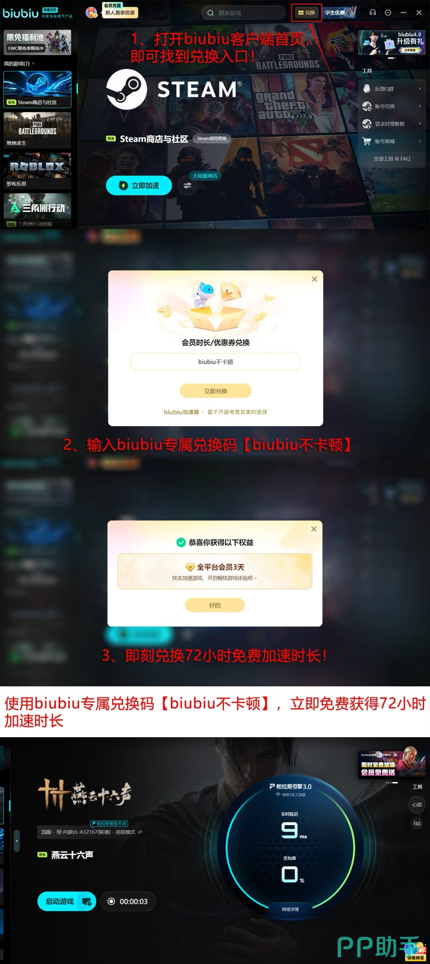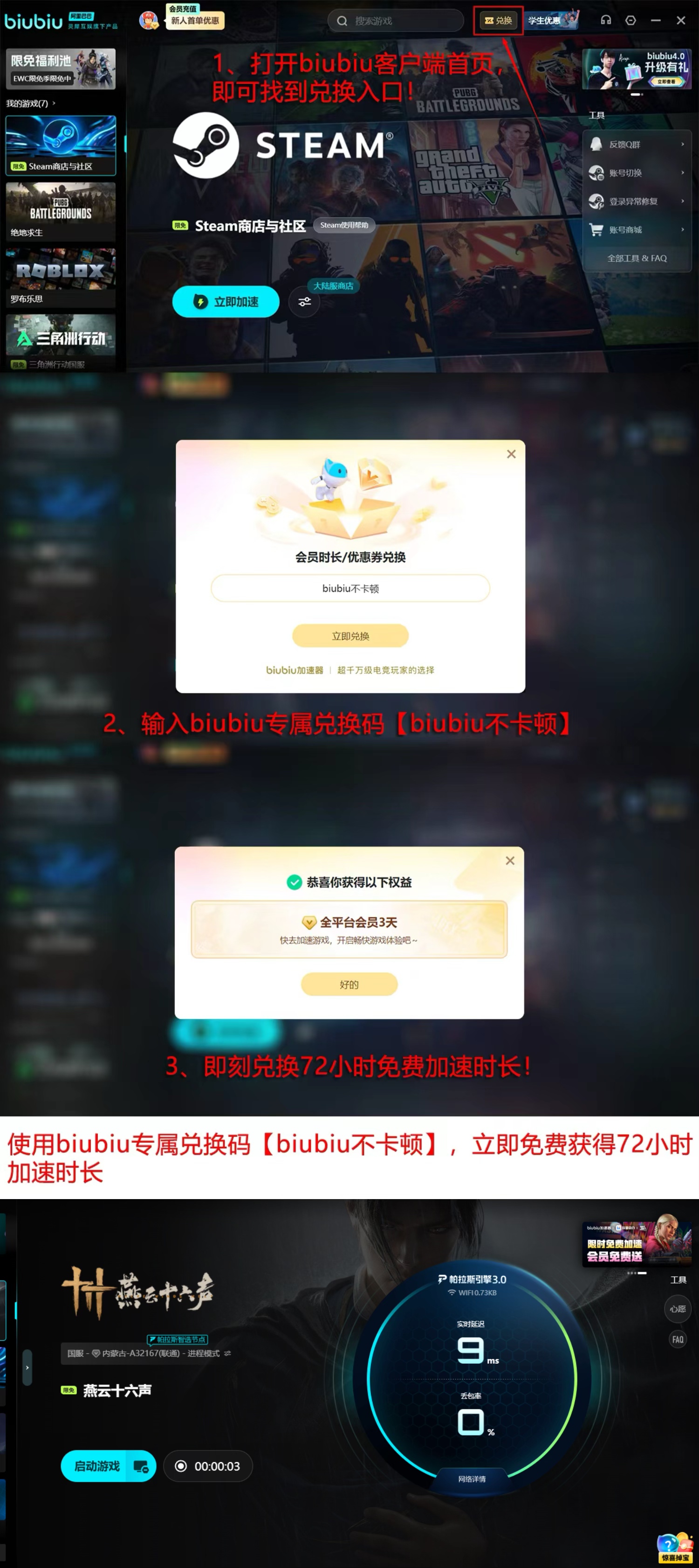 为降低体验门槛,新用户注册后即可立即获得24小时免费加速时长,覆盖完整新手引导、主线任务初段及首次跨服交互全流程,充分验证运行稳定性。同时,所有用户均可凭兑换码【biubiu不卡顿】领取额外3天加速服务,无需付费即可完成中后期高密度战斗场景压力测试。