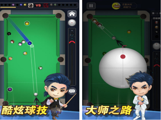 融合街机快节奏风格,主打视觉表现力与竞技对抗性。提供多款可解锁球杆,每支具备独特手感与特效;支持实时PVP匹配,亦含职业赛事挑战路径。采用真实物理3D引擎,兼顾花式击球动作与复杂碰撞反馈,适合偏好强对抗、重操作反馈的用户。