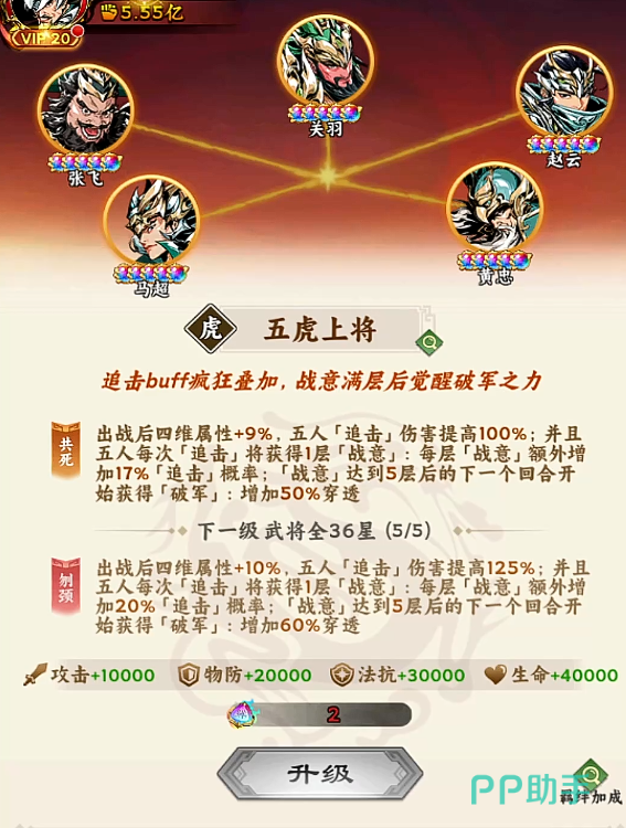 《雄心之上》作为一款以三国历史为背景的卡牌策略类手游,凭借深度阵营构建与武将羁绊系统广受玩家青睐。其中,“五虎上将”阵容是游戏中极具代表性的高适配性体系,由马超、赵云、黄忠、张飞、关羽五位核心武将组成。当五人同时登场时,可自动激活双重专属羁绊,显著提升队伍整体作战效能,成为中后期推图与竞技场的优选配置之一。
