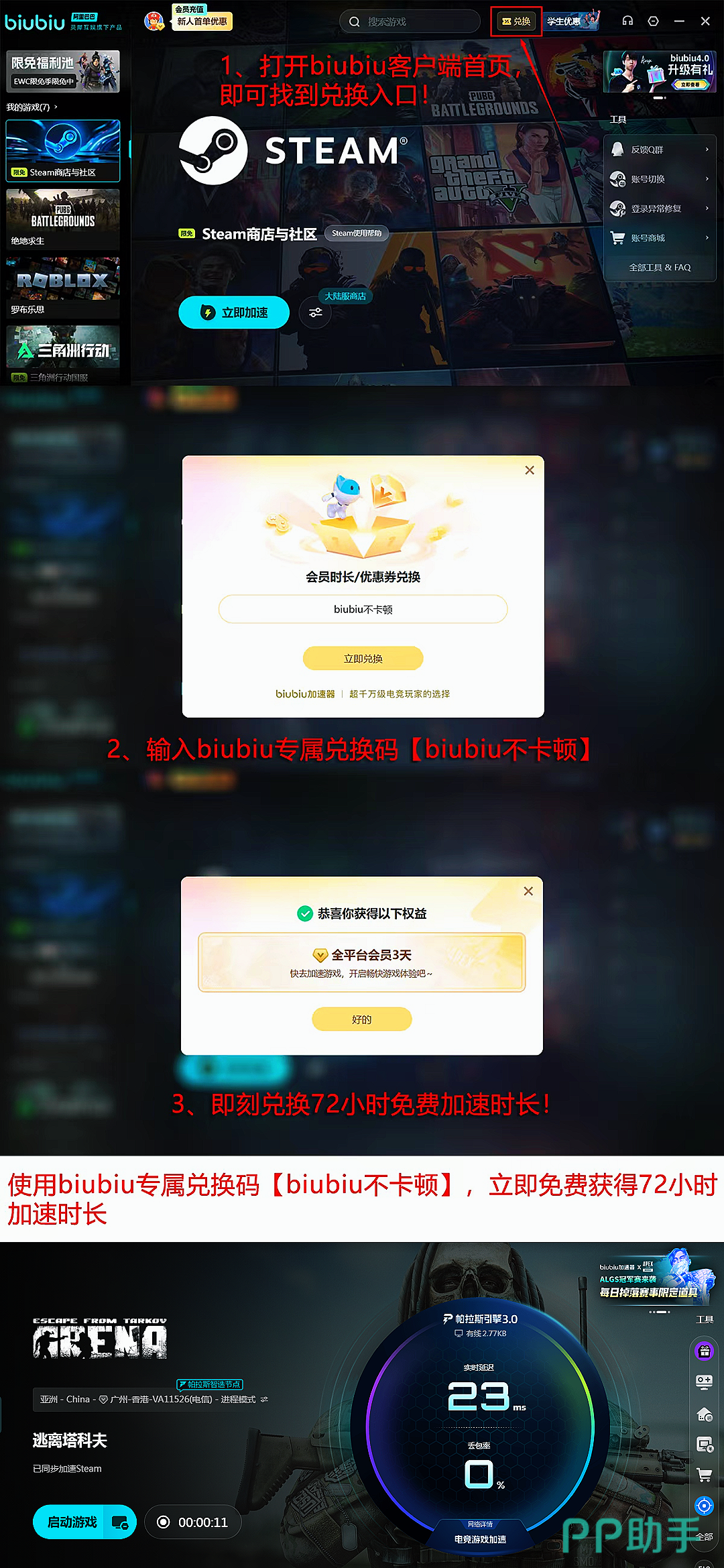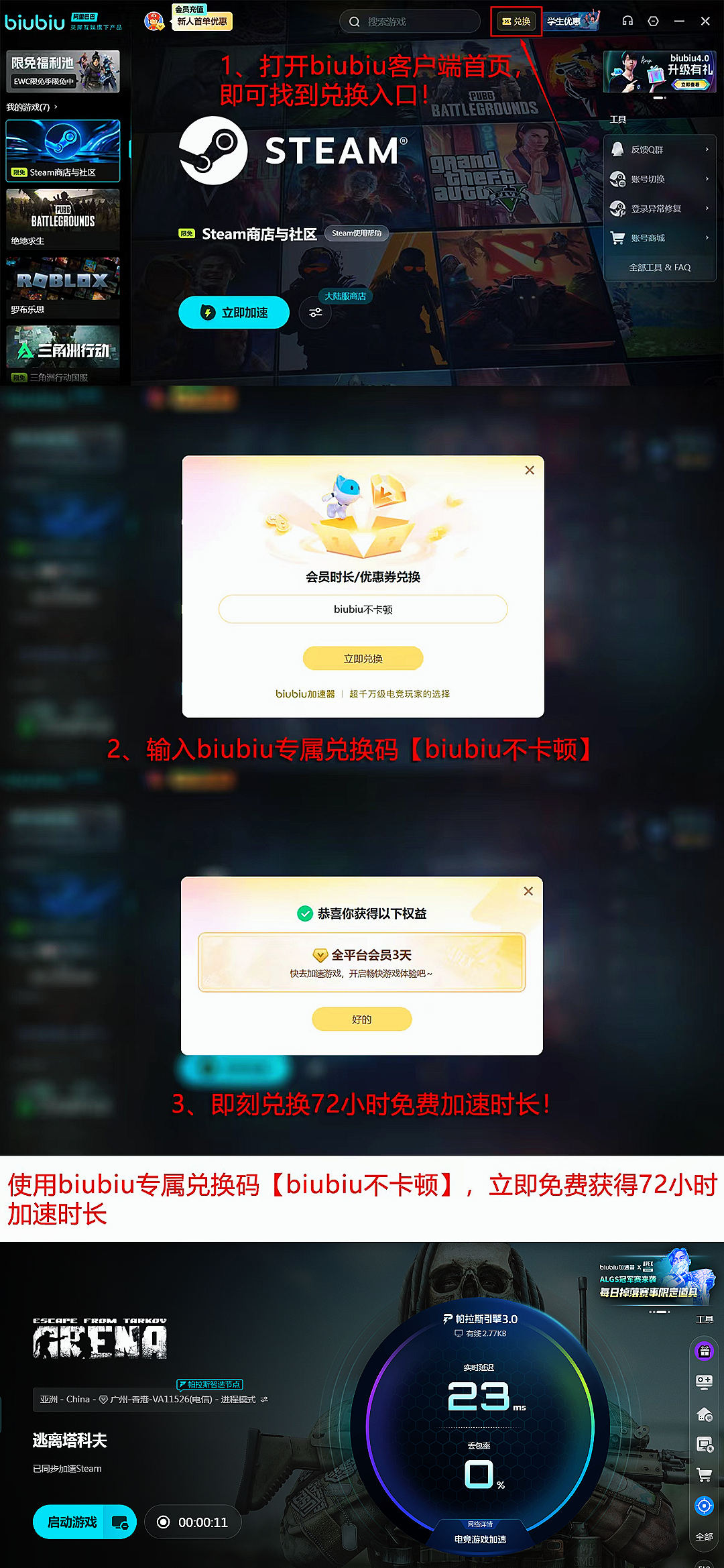 用户反馈显示,启用加速后国际服平均延迟下降42%,连接稳定性提升至99.97%。针对新用户权益,所有注册biubiu即可获得24小时全场游戏免费加速特权,使用兑换码【biubiu不卡顿】还能额外领取3天免费加速时长,总计享96小时长效加速服务,覆盖《逃离塔科夫》全部服务器及任意其他游戏,老用户同样适用。