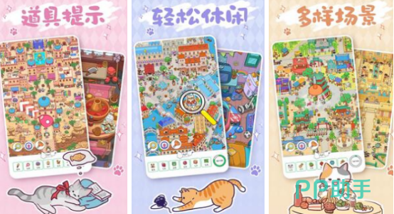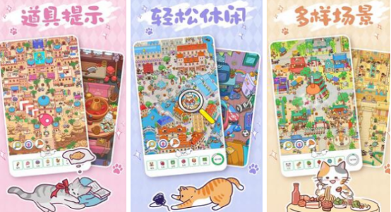 以猫咪为核心叙事载体的寻物解谜类作品,构建多维度拟人化猫角色群像。场景覆盖春日公园、夏夜海滩等十余种手绘风地图,每张画面均嵌入数十个细节考究的隐藏物品,兼顾视觉辨识训练与情境代入感。关卡设计强调观察精度与逻辑联想,适配碎片化时间下的高频互动需求。