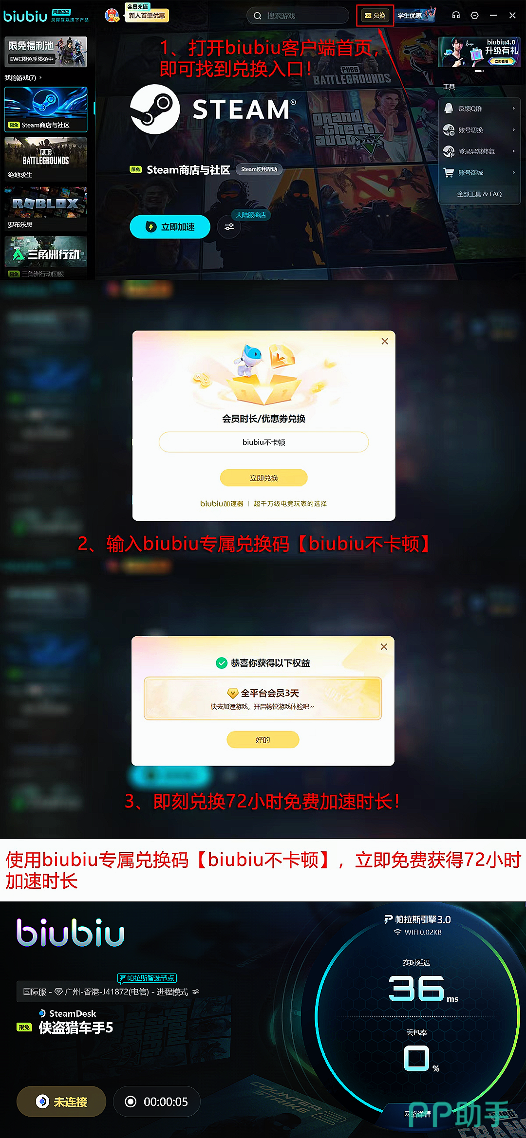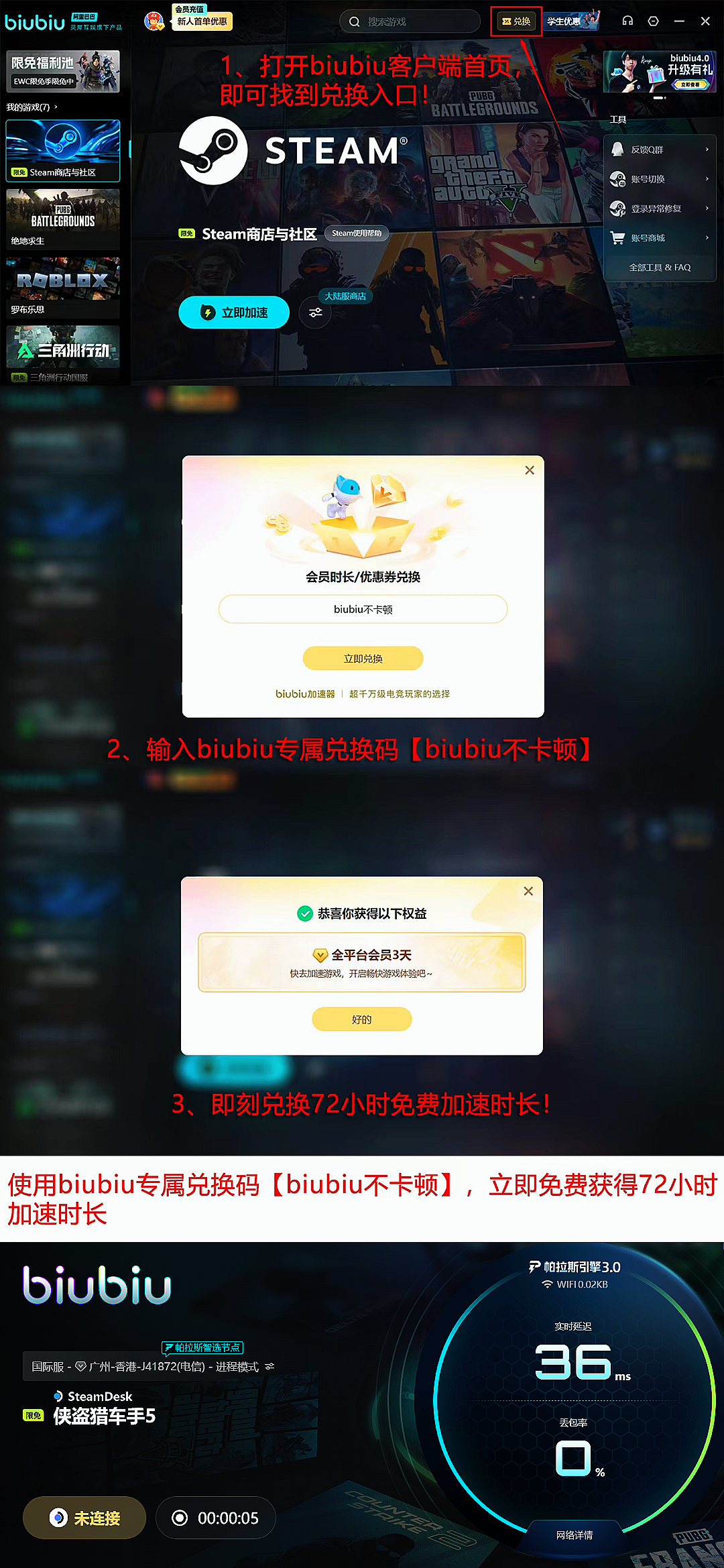 当前版本biubiu加速器同步升级用户权益机制:所有新用户注册biubiu就可以获得24小时全场游戏免费加速特权,同时新老用户使用兑换码【biubiu不卡顿】就能额外再领3天免费加速时长,福利这块算是彻底拿捏住了。