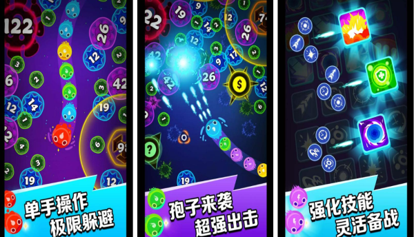 本作构建了一个微观尺度下的激烈战场,玩家将操控单个孢子单位,在动态演化的环境中展开实时对抗。随着关卡推进,敌方孢子数量呈指数级增长,屏幕常被密集单位覆盖;此时玩家可解锁高爆发武器系统,并对孢子本体进行技能树式强化,包括移动速度、分裂频率、攻击范围等维度,从而实现一击清屏的畅快战斗体验。