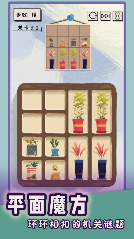 融合拼图解谜与模拟经营玩法,玩家需通过滑动、旋转、嵌套等操作,将散落物件重组为指定图案。独创“循环位移”机制要求预判多步移动路径,手绘风美术呈现细腻纹理与柔和光影,适配碎片化休闲体验。
