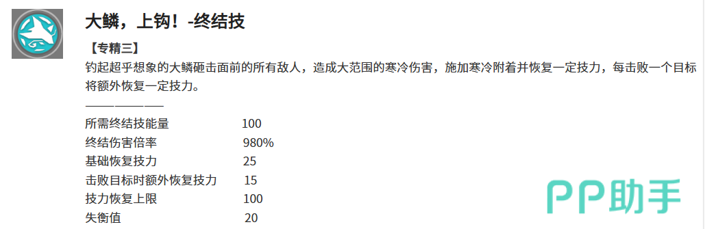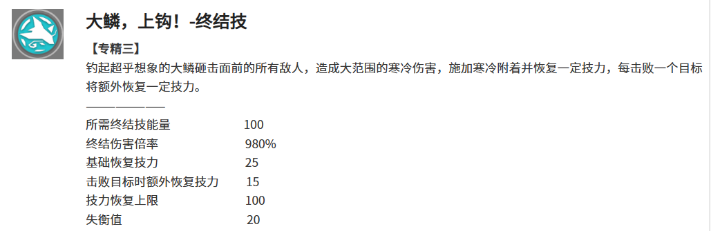 终结技【大鳞上钩】需消耗100点能量,释放后造成980%范围寒冷伤害,自动施加寒冷附着,并固定回复25点技力;每击杀一名敌人额外返还15点技力,上限100点。该技能兼具清场、挂附着与技力反哺三重功能,是衔接战技的关键枢纽——在多目标环境下,终结技释放后常可立即再次启用战技,实现“终结—战技—再终结”的高效循环。其自带的寒冷附着也为后续战技的层数消耗提供了初始保障。