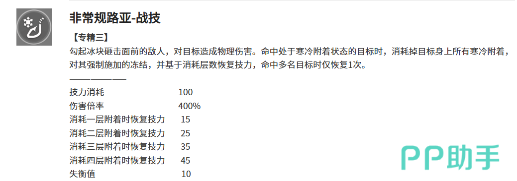 战技【非常规路亚】是阿列什技能循环的中枢。该技能消耗100点技力,对单体目标造成400%物理伤害,并具备双重响应逻辑:若命中已附着寒冷效果的敌人,则依据当前寒冷层数(1~4层)强制触发冻结,并返还对应技力——1层返15、2层返25、3层返35、4层返45。需注意,该技力返还仅结算一次,不随命中敌人数目叠加。因此,维持高层数寒冷覆盖成为提升技能周转效率的核心前提。