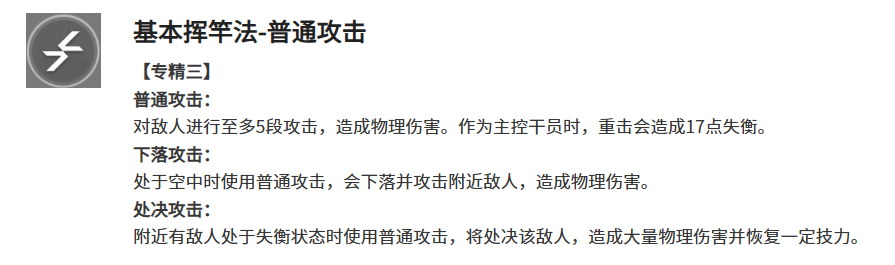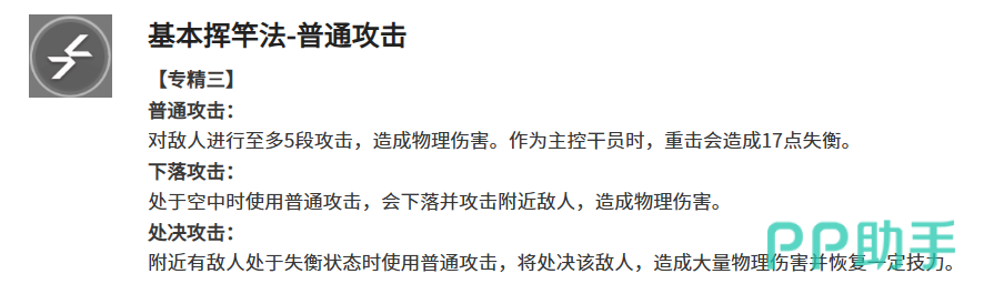 普通攻击方面,阿列什采用五段式物理连击,各段倍率依次为39%、23%、62%、62%与124%,合计伤害倍率为310%。虽基础输出未达顶尖水准,但其普攻具备关键处决判定:当目标处于失衡状态时,任意一段普攻均可触发900%倍率的处决伤害,并同步恢复技力。该机制使其输出高度依赖失衡协同——配合重击可稳定施加17点失衡值,下落攻击则提供180%倍率的常规AOE补充,形成“控—处决—续控”的闭环链路。