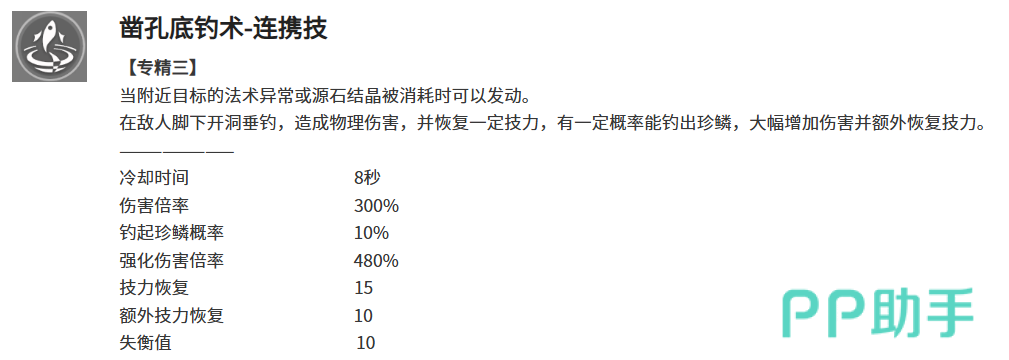 连携技【凿孔底钓术】拥有8秒冷却时间,触发条件为范围内存在法术异常或源石结晶被消耗。基础倍率为300%,并有10%概率触发“珍鳞”效果,使本次伤害提升至480%,同时额外回复10点技力(叠加基础15点,单次最高回25点)。尽管概率机制存在随机性,但在短CD与高频触发场景下,珍鳞实际出现频率趋于稳定,尤其在搭配异常消耗型队友时,可显著强化技力续航能力。