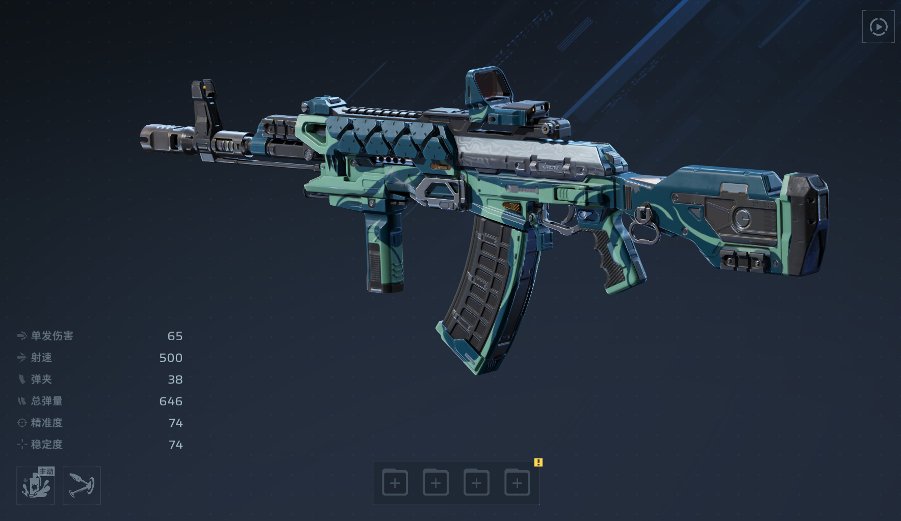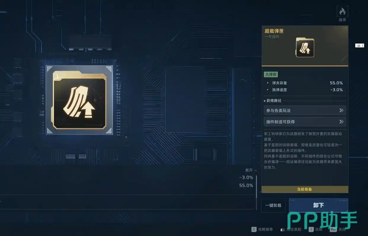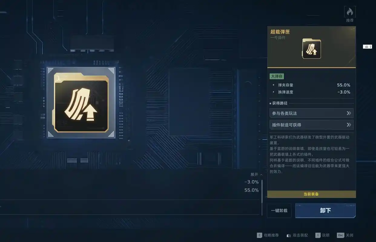 ① 弹药续航型:“超载弹夹”——弹匣容量提升80%,由38发增至69发,显著延长持续火力时间;若暂未获取,可选用“充能弹药”作为过渡,使用主动技能后即时恢复全部子弹,保障输出连贯性。