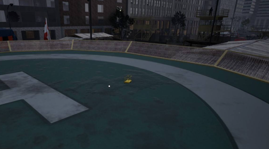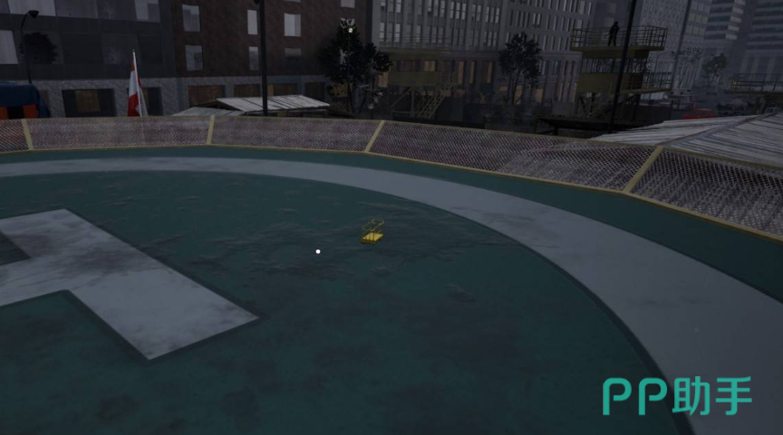 3、迷你推车:抵达仓库后,向直升机停机坪方向移动。在地面标有“H”符号的中心点附近,仔细观察地面细节,该微缩载具静置于标识旁,体积较小需专注辨识。